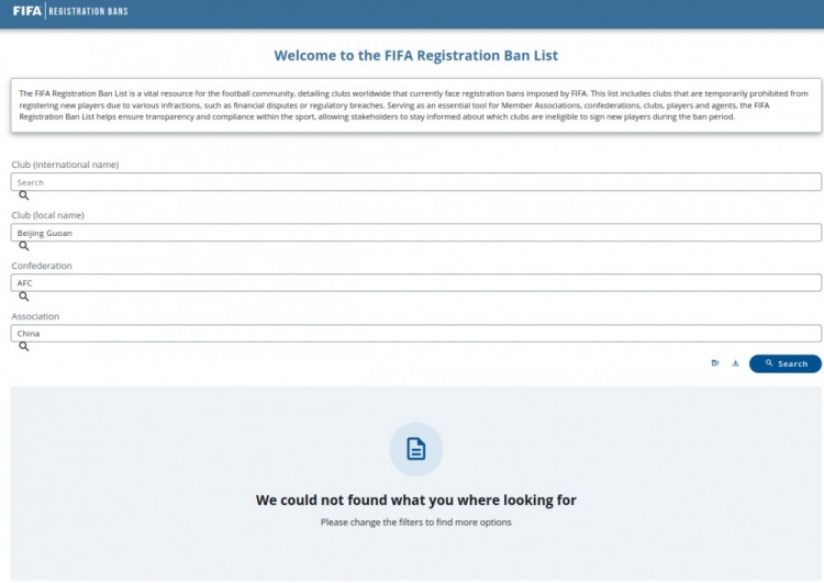 FIFA注册禁令披露系统更新,北京国安的转会禁令已显示无记录